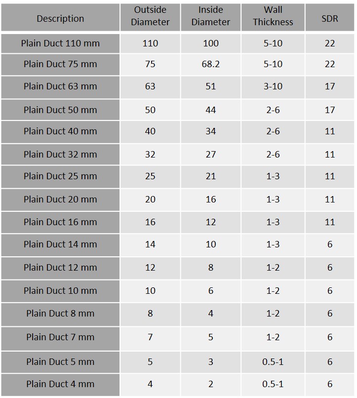 - The HDPE Duct are used for the construction of underground duct system for fiber optic and copper cables in the telecommunication network, Public Information Network, Public transport system, Cable Network, Highway communication and Cable pipeline system.